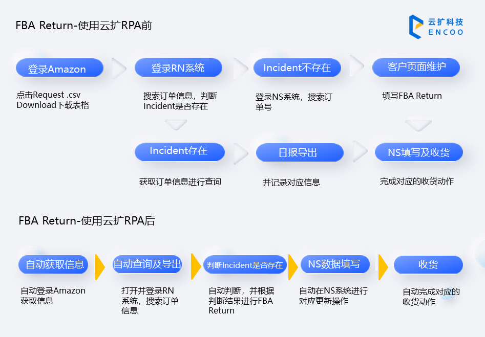 如何在不增加人力成本的前提下,提高工作效率,提升产出,是Yescom集团客服部迫切想要实现的目标。以RPA+ LCAP双驱模式的云扩超自动化平台,完美契合客服部门降本提速的需求,通过云扩成熟的企业级自动化解决方案,客服部充分优化业务流程,在不增加人力基础上高效提升部门承载力,加速业务流转。以FBA Return流程自动化为例,云扩智能RPA可自动登陆 Amazon后台,按照人工操作步骤访问Amazon平台下载数据表;登录到RN系统,根据Amazon系统获取订单信息进行查询并记录对应信息,对订单进行退款处理;并同时在NS系统进行对应更新操作。人工单条处理需10分钟,云扩RPA机器人仅需2分钟,效率提升5倍以上。