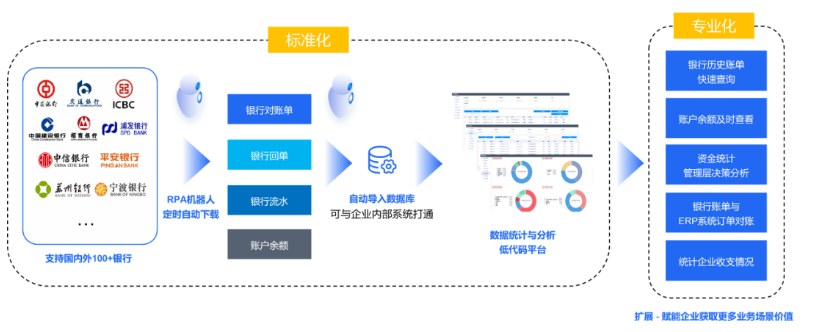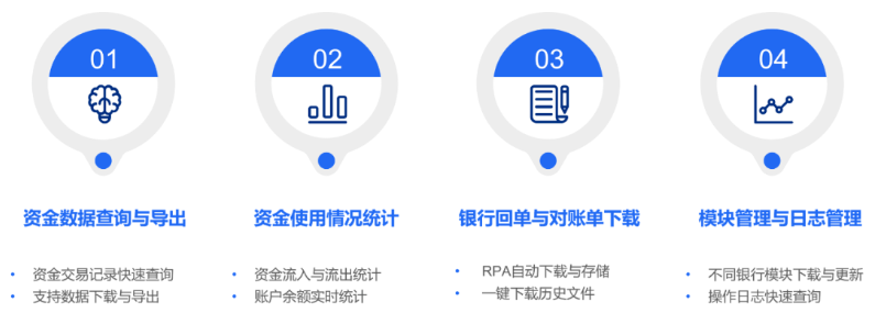 针对处理网银事务时的这些痛点,云扩网银管家采用自研RPA+LCAP技术,实现RPA机器人随时随地自动登录各大网银,下载银行流水、回单、余额等数据,财务人员只需登录网银管家系统即可快速查询想要的网银数据。