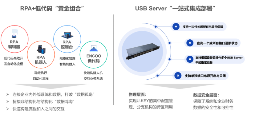 云扩网银管家通过提供软硬件一体化解决方案,将散落保管的U盾集中部署到USB Server上,一站式集中管控包括网银盾、查询盾、制单盾、复核盾、主管盾等多种类型的U-KEY。