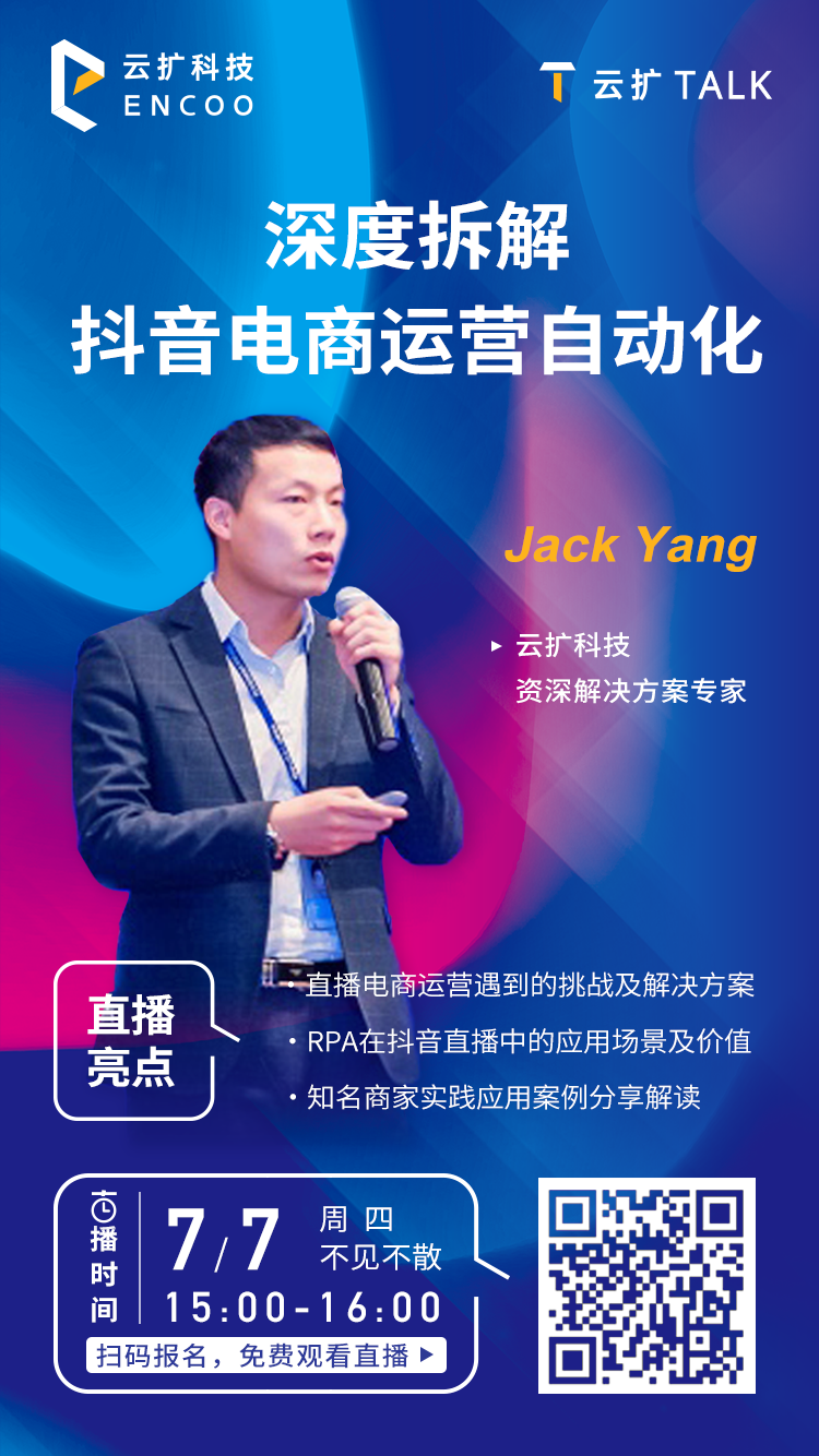 传统互联网流量见顶,以抖音、快手、小红书为代表的兴趣电商逆势发展,快速聚集海量流量。伴随各大电商平台进入流量“洗牌”阶段,抖音提出「全域兴趣电商」,抖音巨量引擎以商家需求为核心,增加了搜索和逛商城场景,通过曝光、种草产品与转化产品链路打通,提高交易转化率。从电商到兴趣电商再到「全域兴趣电商」,都是行业为满足用户对美好生活的多元需求而进行的模式升级。对于商家而言,如何在竞争白热化的市场环境下快速起量,引爆销量激发增长,成为当下最迫切的问题。兴趣电商基于用户数据而生,如何实现大数据算法下精准投放、运营,更好地盘活用户数据?在一个竞争早已经成为红海的领域,商家如何找到自己的独特价值,吸引客户?随着互联网红利见顶,各大电商平台流量分化不可避免,如何利用抖音电商为店铺高效引流?云扩生意方舟解决方案应运而生,助力品牌电商精细化运营。在抖音小店后台、精选联盟、抖音电商罗盘、巨量千川、巨量引擎、巨量百应等多个系统提供数据自动化支持。7月7日下午15点,云扩科技资深解决方案专家Jack Yang将为大家深度拆解电商运营自动化,帮助商家以创新技术提升商品开发能力、消费者触达能力、供应链供给能力,为用户提供“一站式”购物体验;同时,结合知名品牌数字化案例,展示RPA+LCAP应用最佳实践,助力商家全面长效发展。- 电商市场日新月异,直播电商运营遇到的挑战及解决方案;