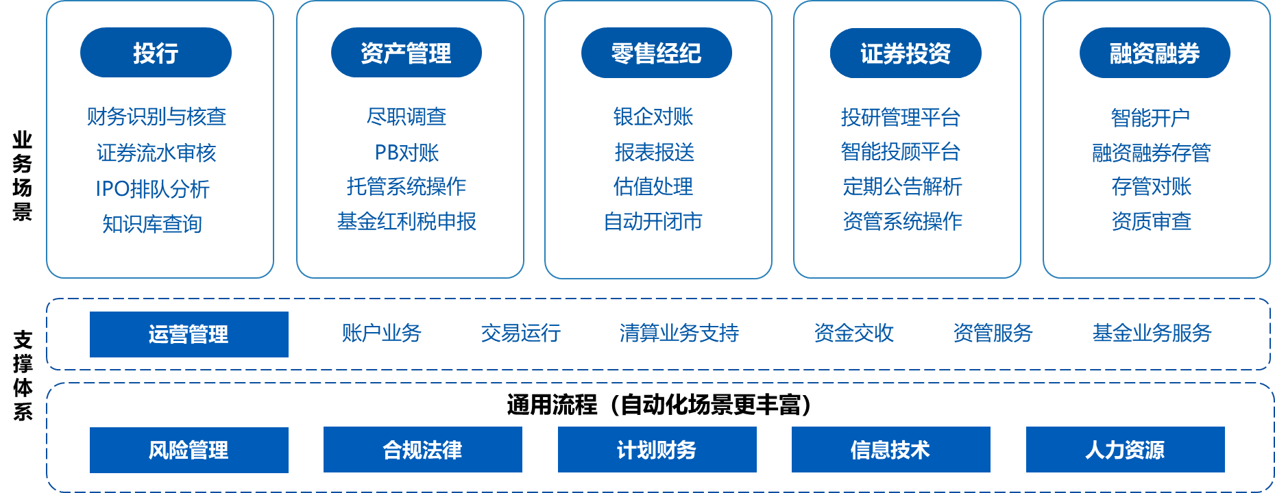 自动化场景遍布各部门,覆盖前台业务场景与支撑体系。