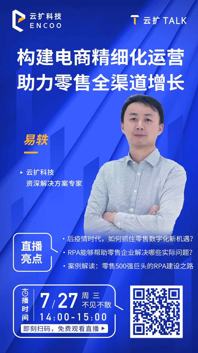 为助推零售电商启新创变、重塑增长,7月27日下午14点,云扩科技资深解决方案总监易轶,将带来《构建电商精细化运营,助力零售全渠道增长》主题演讲,与您共同探索零售数字化、零售电商精细化运营的趋势与未来!