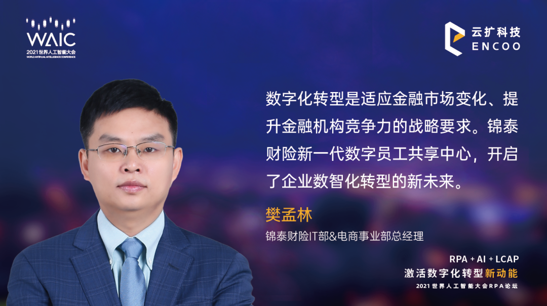 中国信通院云计算与大数据研究所所长何宝宏揭示了RPA产业发展内外驱动力,介绍RPA技术产业生态发展现状,以及RPA未来云化、智能化的发展路径等趋势,并表示:“我们将携手云扩科技,共同推进RPA行业工作的标准化,促进RPA技术的创新发展,构建良好的应用生态和环境。”“以人工智能构筑城市数字共同体,用可信算法让世界更美好。”上海人工智能研究院有限公司总经理、上海交大人工智能研究院副院长宋海涛表示,“新常态下,包括RPA在内的众多加速人工智能落地的技术,正在创造万物智能的新时代,智能化将对人类社会形成升维重构”。开展数字化转型是适应金融市场变化,提升金融机构竞争力的战略要求。锦泰财险IT部&电商事业部总经理樊孟林指出,通过在锦泰财险7个部门35个流程中应用云扩智能RPA,构建锦泰财险新一代数字员工共享中心,开启了企业数智化转型的新未来。在数字经济时代,唯有业务敏捷性更高的企业才能掌握先机。RPA可将大量碎片化业务交互场景实现自动化,加上最近一年多疫情的催化,RPA市场呈现指数级增长。进入工业4.0时代,制造业数字化转型迫在眉睫。在《RPA+AI重塑制造业智能生产力》圆桌对话中,国药集团化学试剂物流与信息分管副总刘璺、盛虹集团CIO温智惠、亨通集团CIO张征平以及云扩科技制造事业部总经理沈建春,围绕RPA+AI在行业内的落地应用,分析RPA+AI应用的最佳实践,展望RPA与行业应用融合发展未来。数字化已经成为驱动传统零售到全场景零售的有效方式之一。中国连锁经营协会行业创新与发展部主任田芮丰、可口可乐亚太地区基础设施和运营总监 Jerry Ji、 及云扩科技零售事业部总经理 Christy Zhao围绕《RPA+AI赋能零售快消商业进化》,共同探讨RPA如何帮助企业提升自身运营效率、洞察消费趋势,快速拥抱新零售变局。为表彰智能自动化浪潮中引领企业转型、拥抱数字化变革的践行者,RPA产业推进方阵携手云扩科技,共同颁发了“2021中国智能自动化先锋人物”以及“2021中国智能自动化创新案例”荣誉奖项。来自国药试剂、亨通集团、玛氏箭牌、爱丽家居、龙洋木业、亚太财险、盛虹集团、泉峰中国、同方人寿、联合利华创想+、泰隆银行、兴业数金、浙江森马、中化金茂、众华事务所、等优秀企业的管理者们登台领奖。骐骥千里非一日之功,智能自动化之路任重道远。今年是“十四五”的开局之年,云扩科技将继续携手生态合作伙伴,同心协力、锐意创新,推动RPA+AI+LCAP在各行业不同业务场景的落地,助力产业智能自动化升级,推动企业实现强劲增长。