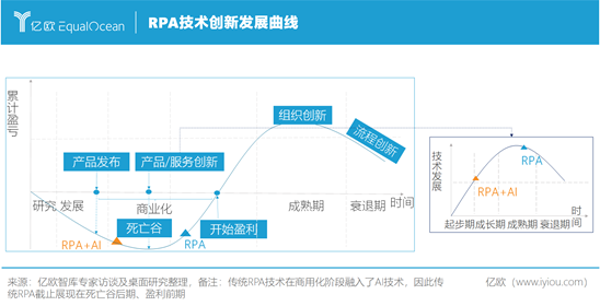 据此前亿欧智库发布的《千帆竞发—2021RPA赋能企业数字化转型》报告显示,从技术创新型曲线的生命周期看,由于传统RPA出现较早,技术已步入成熟期、且已跨过“死亡之谷”;而智能RPA产品和服务创新目前正处于高速成长期,市场上也存在较多噪音。