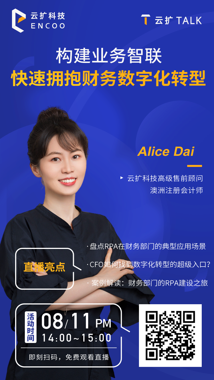 然而,企业在采用RPA及LCAP技术时经常会有以下疑问:财务工作面临的问题显而易见:繁重的重复性工作,周期性“996特质”,极高的业务响应要求,团队协作困难,第三方软件制约等。用RPA来应对财务数字化转型面临的挑战时,有哪些优势和劣势?不同行业、不同领域的公司,其财务工作有一定程度的相似性,但是也不乏有“个性化”因素在其中。那么,IT供应商在服务企业过程中沉淀出的通用解决方案,究竟是否可以直接拿来使用?业财融合大行其道,财务作为“突破口”来打通数字化全局、穿越周期实现高质量发展,正成为企业的选择。然而,企业如何从众多复杂的财务场景中,选择最佳落脚点?为帮助企业更加深入地了解RPA+LCAP在企业内部的应用,加速数字化转型,8月11日14:00云扩科技高级售前顾问、澳洲注册会计师Alice Dai将带来《构建业务智联,快速拥抱财务数字化转型》主题演讲,详细解读财务数字化转型,解析智慧财务之道,依托应用场景和成功案例,以行业实践还原管理真知,助力企业推进财务数字化转型。