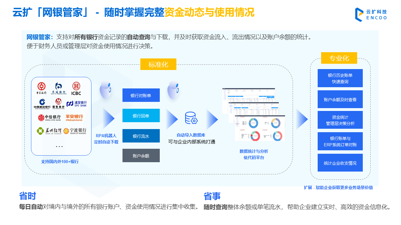 云扩财务RPA解决方案-网银管家可实现对企业所有银行账户资金记录的自动查询与下载,及时获取资金流入、流出情况以及账户余额变动,便于财务人员或管理层对资金使用情况进行决策与分析,有效地帮助企业节省了大量时间与人力成本,极大提高了企业的经营效率,现已覆盖工行、中行、建行、农行、招行、兴业、中信、广发等国内外100多家主流银行。