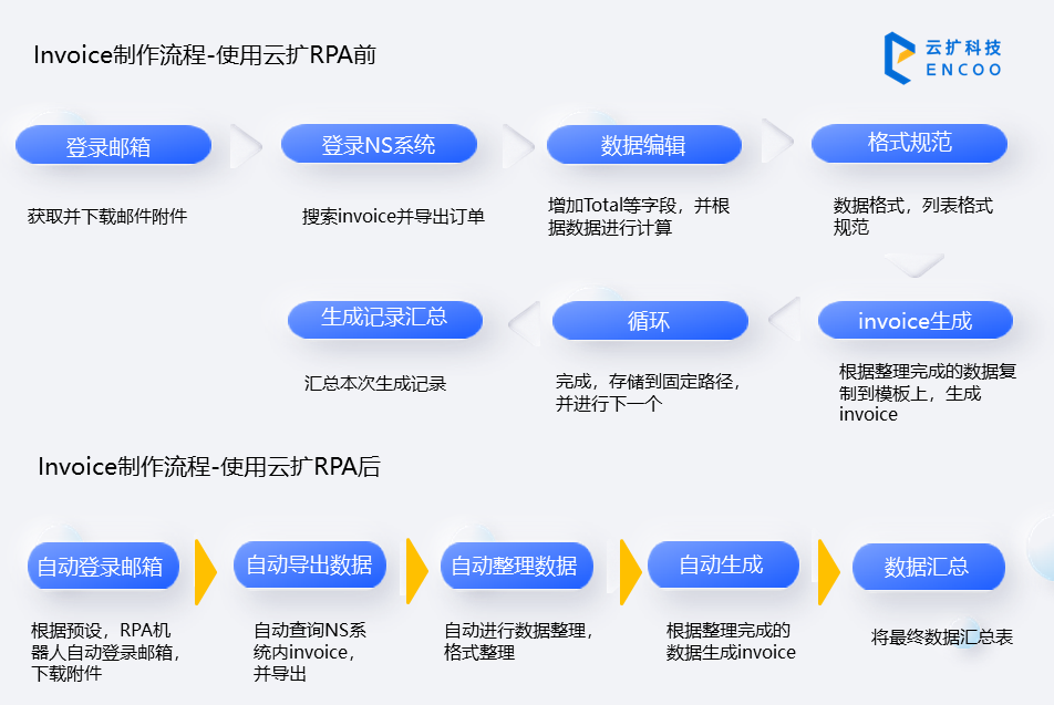 财务部数据量庞大,流程标准化程度高,重复性工作较多,且其数据掌控力直接关系到集团整现金流把控,为推进业财一体化深入,加速智慧财务建设,Yescom集团财务部在云扩科技辅助下,充分挖掘内部流程,在多个业务流程开展RPA试点工作,并快速锁定云扩数字员工的上岗场景—Invoice制作流程自动化。云扩RPA可自动进行获取“跟单Invoice制作”的邮件及相关附件;登录NS系统,根据既定搜索条件,搜索Invoice明细并导出excel文件;自动完成数据整理与汇总,输出固定格式文件。整体流程提升超85%+,准确率达100%。不积跬步,无以至千里!业财融合建设非一蹴而就,需借助超自动化、人工智能、低代码等众多新技术,革陈出新,打造针对性的标准化端对端流程自动化,才能在不增加人力成本的基础上更好提升效益,全面提升财务掌控力。赢之道,与时偕行!我国跨境电商行业正处新时代高速发展中,风险与机遇同行,作为行业翘楚Yescom,凭借着果决数字创新与实践,一路高歌猛进,在数字洪流中牢牢掌握主动权,与云扩科技共建智慧生产力矩阵,以超自动化技术组合,精准解决业务痛点,加速完成数字化转型,以灵敏时效性在瞬息万变的全球市场中赢得发展先机!